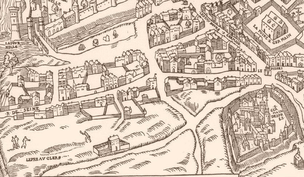 Vous retrouverez ci-dessous : Carte de Paris de 1553 montrant des joueurs de longue Paume en extérieur près de la rue de seine
